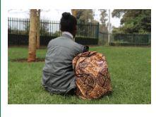 The Jesse Kitenge Backpack features a striking brown and gold geometric pattern, crafted from sturdy fabric for durability. The intricate design includes repeating circles and lines, creating an eye-catching visual effect. It comes with two straps for comfortable carrying on the back, combining both style and functionality in a versatile accessory. Height: 15.7inches, Width: 14.6inches, Base: 12inches