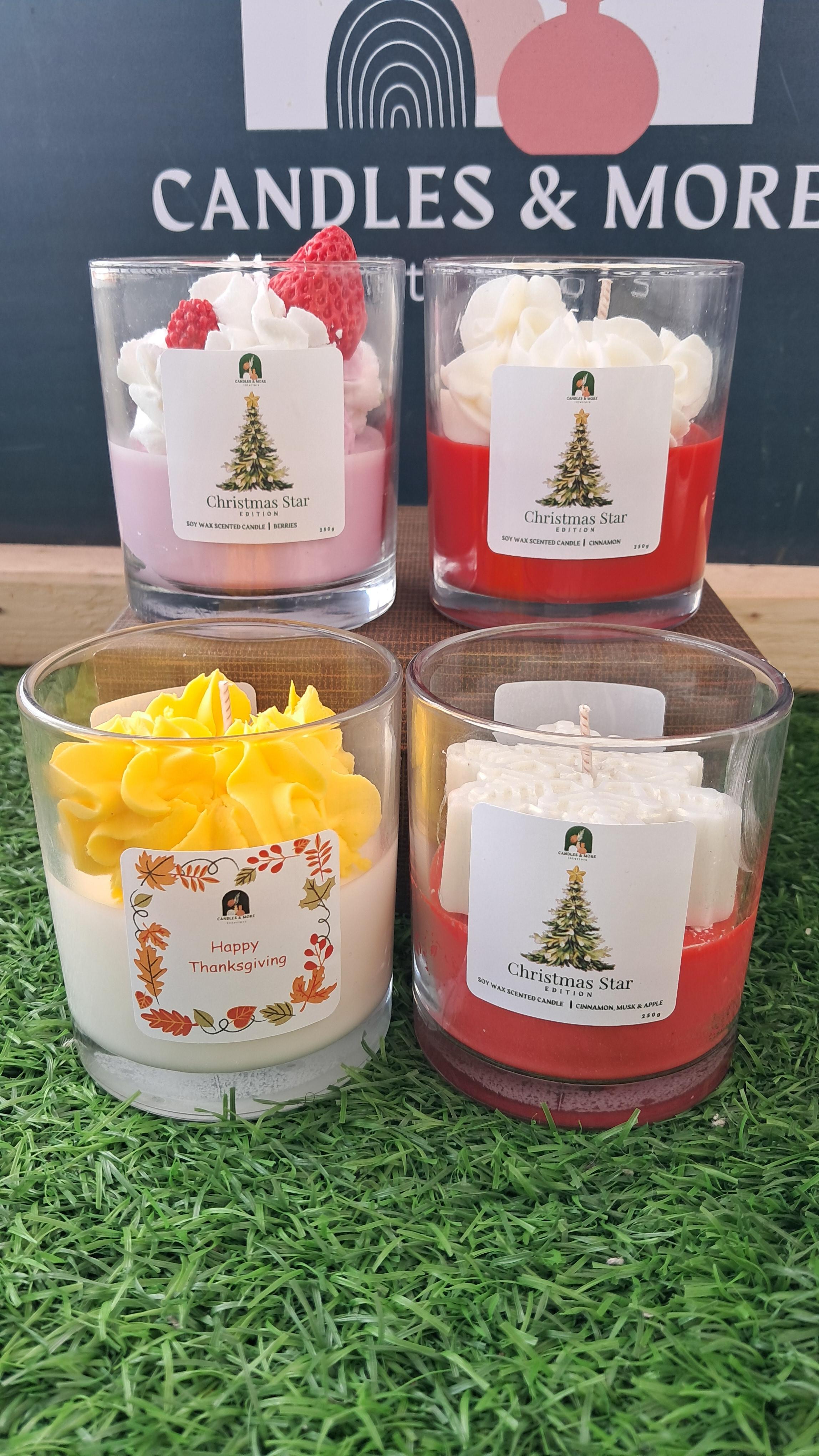 Celebrate Christmas with amazing scented soy wax candles. Available scents, Cinnamon, Musk, Apple, Berries, Apricot & Peach, Vanilla,Peppermint, and Lemongrass.